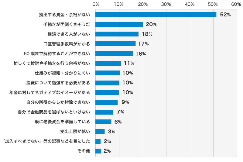 一方、加入を希望しない人にその理由を聞いたところ、もっとも多かった「拠出する資金・余裕がない」に次いで、「手続きが面倒」「相談できる人がいない」「口座管理手数料がかかる」「60歳まで解約できない」などがありました。