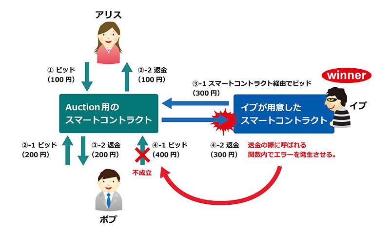 問題となり得るのは、スマートコントラクト経由でビッドを行われてしまうケースです。ここでイブが用意したスマートコントラクト経由でイブが300円相当でビッドしたとします(③-1)。このタイミングでボブに200円返金されます(③-2)。続いてボブが400円相当でビッドしたとしましょう(④-1)。同時にイブが用意したスマートコントラクトに対して返金されようとしますが(④-2)、イブのスマートコントラクト内に送金の際に呼ばれる関数内にわざとエラーを発生させるような処理があると、エラーに引きずられてボブのビッドも成立しません。つまり、以降は誰もビッドできなくなり、イブは必ずオークションに勝つことができるのです。田篭は「スマートコントラクトのプログラムを開発する際には、こういった脆弱性が入り込む可能性を意識しなければなりません」と話します。