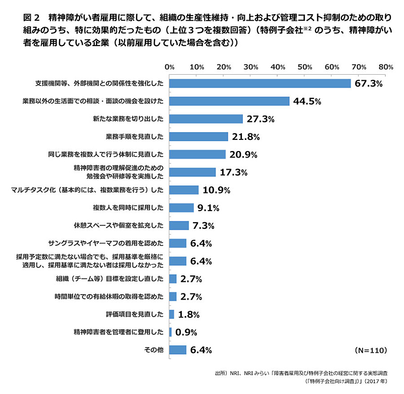 日本においても、外部支援機関との連携が効果を挙げているというデータがあります。NRIが2017年に実施したアンケートにおいて、精神障がい者雇用に際して、組織の生産性維持・向上および管理コスト抑制のための取り組みのうち、特に効果的だったものとして、「支援機関等、外部機関との関係性強化」が挙げられています。