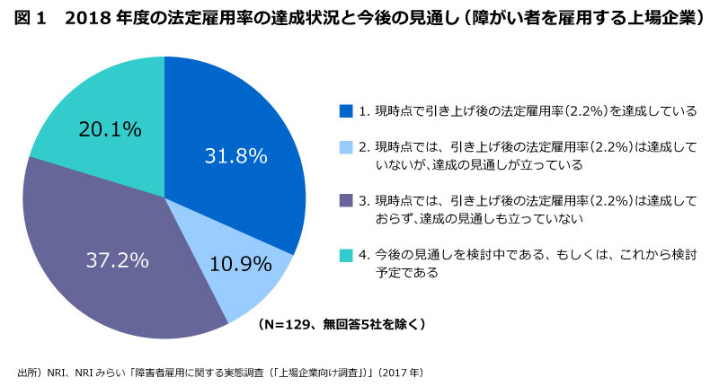 NRIが2017年に実施したアンケートによると、2018年度に施行される法定雇用率2.2%をアンケート実施時点で達成している上場企業は、31.8%にとどまっています。つまり、今後約7割もの企業が法定雇用率達成に向けて、新たに雇用拡大することが求められているのです。