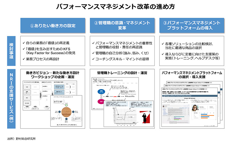 NRIでは「パフォーマンスマネジメント改革」を提案しています。「パフォーマンスマネジメント」とは、社員の能力・モチベーションを引き出し、成果へと結びつける人材マネジメント手法です。短期的には、部下・チームのパフォーマンスの向上、中・長期的には、人材育成を通じた組織力の強化につながります。多様な経験値を積み上げ、個人としての価値を高めていくことができるように社員の働き方を上司や会社が支援していき、会社全体としても良くなっていくことを目指すのです。