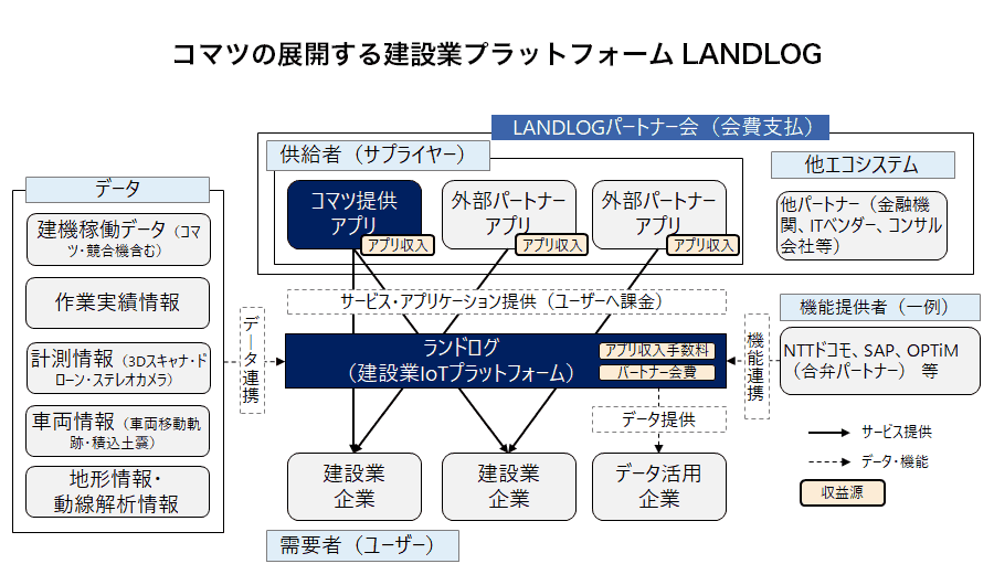 一例が、コマツが展開しているオープンIoTプラットフォームの「ランドログ」です。AWS(アマゾン・ウェブ・サービス)などがあらゆる産業向けに、さまざまなモノがネットにつながるIoTクラウド・プラットフォームを提供しているのに対し、ランドログは建設業に特化しています。自社や他社の建機データ、ドローン等を用いて計測した現場データ、労働者のデータなど、あらゆる建設関係データを蓄積し、他のITアプリケーション・ベンダーも巻き込んで、建設関係のソリューションを提供するモデルをつくっています。