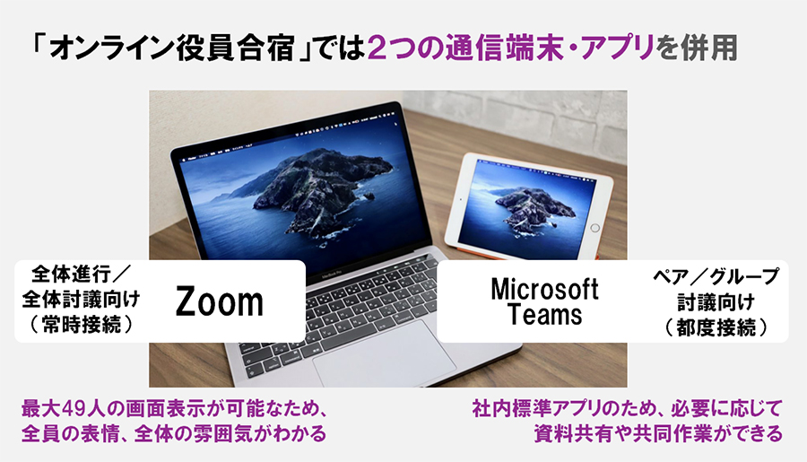 「これまで対面形式でやってきた時のようなコミュニケーションが、オンラインで実現するかどうかは分かりませんでした。しかし、役員合宿を通じて育んできた経営陣の信頼関係と変革へのモメンタム(勢い)を途切らせてはならないと考え、オンライン開催を決断しました」
