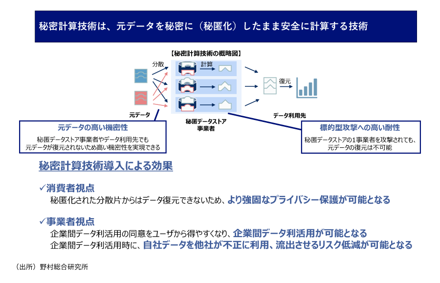 「元のデータがわからないように分割して処理を行う技術なので、一事業者が攻撃されてもデータが漏れるリスクが低減します。消費者のプライバシー保護はもちろん、ビジネス視点では企業間のデータ活用が飛躍的にしやすくなる。ここ1~2年、アメリカや中国、日本などの大企業が実証実験を進めていて、サービス実現に取り組もうとしています」