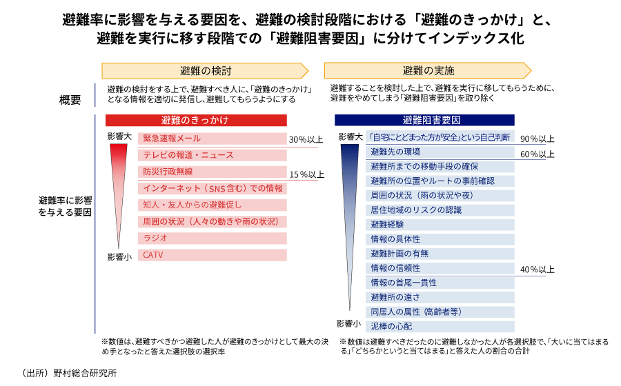 避難率に影響を与える要因を、避難の検討段階における「避難のきっかけ」と、避難を実行に移す段階での「避難阻害要因」に分けてインデックス化すると、避難のきっかけでは、緊急速報メールや防災行政無線が避難率に大きく影響し、避難阻害要因としては、「自宅に留まった方が安全」という自己判断や、避難先の環境に対する不安が大きいことがわかりました。