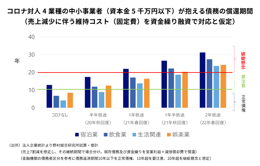 一方で、これは資金繰りの面からは融資が積み重なっていくことを意味します。「対人3割経済」が継続すると、2年以内に「コロナ対人4業種」の債務返済が困難な水準に達する恐れがあります。
