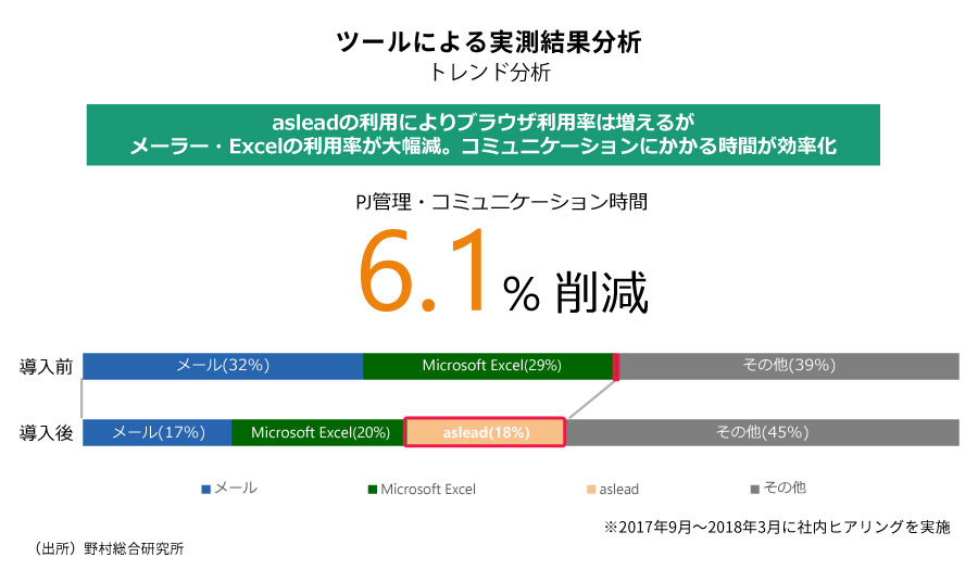 蒋:プロジェクト管理やコミュニケーションにかかる時間がどの程度削減されたかを分析したところ、asleadを使うためのブラウザ利用時間は増加するものの、メーラーやタスク管理のためのExcelの利用率が大幅に下がり、トータルで6.1%の時間が削減されたという結果が出ています。体感的な削減時間をヒアリングした際も平均48.7分という回答を得ており、感覚的には計測結果以上の時短につながっているようです。メールを書くよりasleadを使ったほうが効率的に仕事が進みますし、情報やナレッジを共有するスピードが上がるため会議の回数を減らすことができます。そのようなところがテレワーク時代に適応しているのだと思います。