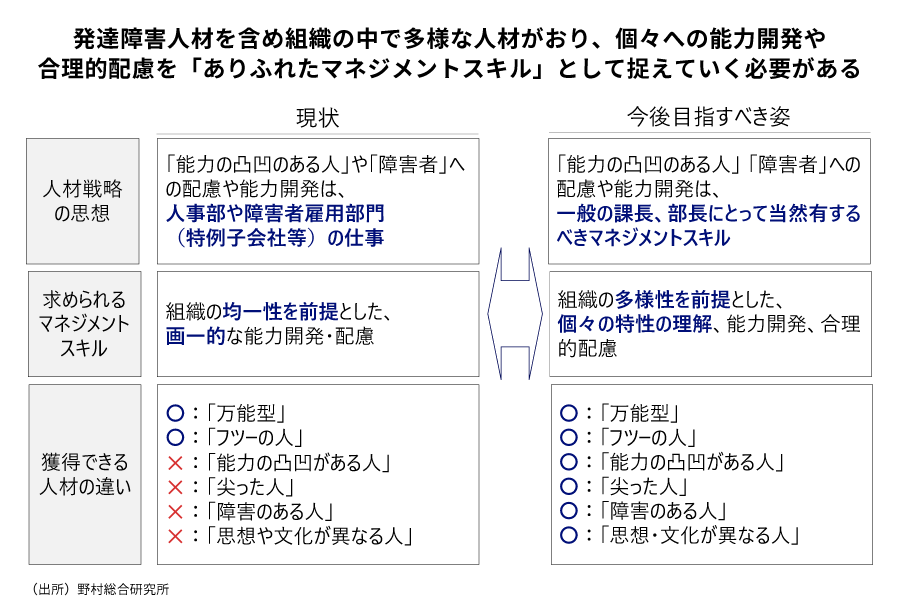 また、一般雇用の枠組みにおいて万能を求めることなく、個人の才能を最大限に発揮できる特定の職域で活躍ができる機会を設定することも重要です。スペシャリスト、高度スペシャリストとしての職域を拡大していくには、組織には発達障害人材を含め多様な人材がいることを前提とし、個々への能力開発や合理的配慮を「ありふれたマネジメントスキル」として捉えていく必要があります。そのためには、個人の才能の発揮は本人の資質や努力に加えて、周囲の環境が大きく影響するといった理解のもと、人材マネジメントの形を変えていく必要があると言えます。