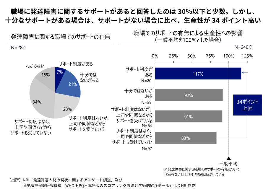 生産性については、「サポート制度がある」場合は一般平均に対して117%と平均より高くなっているのに対し、「サポート制度はなく、上司や同僚などからサポートも受けていない」場合は、一般平均の83%と生産性が低くなっていることが判明しました。