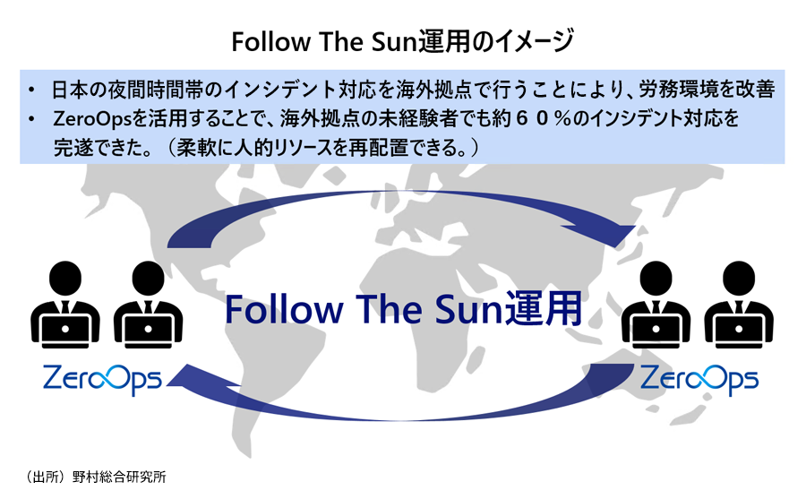 岸間:このほかに、フォロー・ザ・サンという施策を行っています。システム運用は24時間、365日止まることがない仕事です。そのため、インシデント対応は昼夜を問わず、真夜中に対応をしなければいけないケースもあります。そこで、日本と時差のある海外に運用拠点を整備し、日本の夜間帯には海外拠点で運用業務を担うようにしました。この施策とZeroOpsを組み合わせることで、システム運用における品質の維持と効率化の実現を図っています。