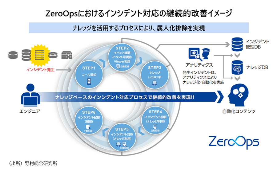 山崎:属人化のZero化を目的に、新たな運用機能やプロセスの整備を実施し、「ZeroOps(ゼロオプス)」というサービスを構築しました。ZeroOpsでは、過去に発生した障害とその対応手順を「ナレッジ」として蓄積/再活用するナレッジ利用型インシデント対応プロセスを規定し、そのプロセスで利用する運用機能の提供や、運用プロセスの導入支援などを実施しています。属人化の排除には自動化することが有効な手段の一つだと思いますが、自動化は一足飛びには実現できません。ZeroOpsでは、一つ一つの積み重ねの中で、そこに至るまでの継続的な改善サイクル・PDCAを回せるようなプロセスを規定して適用しています。また、複雑化したシステムの稼働状態を統合的に把握するために、アラートやログ、メトリクス情報を取り込み可視化するといったことも、ZeroOpsでは提供しています。