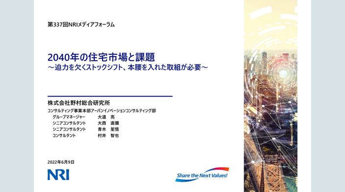 野村総合研究所(NRI)では毎年、日本の住宅市場に関する予測を行っています。恒例の「2022~2040年度の新設住宅着工戸数」「2021~2040年のリフォーム市場規模」に加え、今年度は新たに「2019~2040年度の既存住宅(新築以外の住宅)流通量」を推計・予測しました。新設住宅着工戸数は中長期的に見てどのように推移していくのか、ウクライナ紛争やコロナ禍に伴う供給制約はどのような影響をもたらすのか、予測に当たったコンサルティング事業本部のメンバーに聞きました。