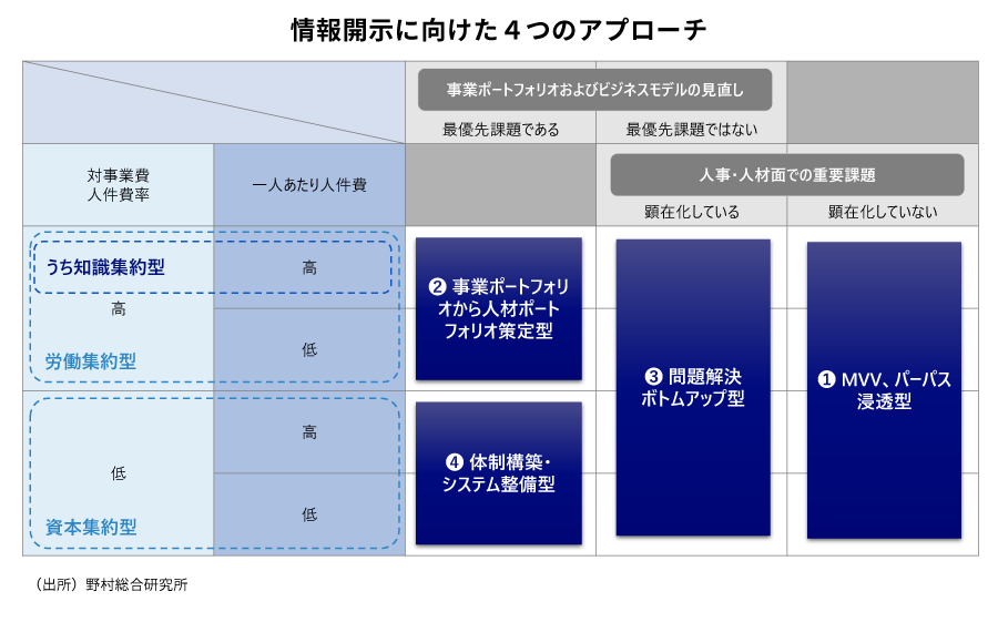 先行企業を分析すると、情報開示に向けたアプローチは大きく4つに整理できます。①経営理念、ミッション、ビジョン、パーパス(存在意義)を軸に求める人材像を定義し、人事施策を打ち出す。②中長期戦略に沿って要員計画を立案し、人材獲得施策を説明する。③ボトムアップで現状の人事問題を抽出し、解決策を積み上げて開示する。④CHO(最高人事責任者)職などを設置し、人事系ツールやデータ基盤に投資するなど、体制構築やシステム整備を通じて本気で取り組む姿勢を示す。先行企業はこのうち1つに絞り込むというよりも、どれかを起点にいくつか組み合わせて取り組んでいます。