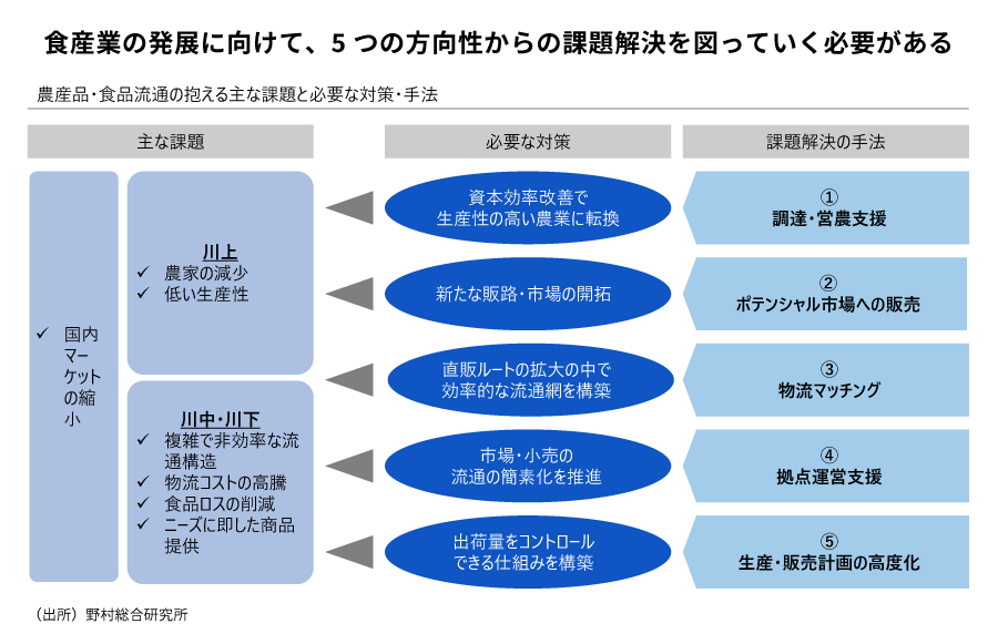 こうした各関係主体の課題に加えて、食関連企業は国内マーケットの縮小という市場全体の問題も抱えています。成長のためには、海外展開をはじめとする新たなマーケットの開拓を含めた検討が必要になるでしょう。