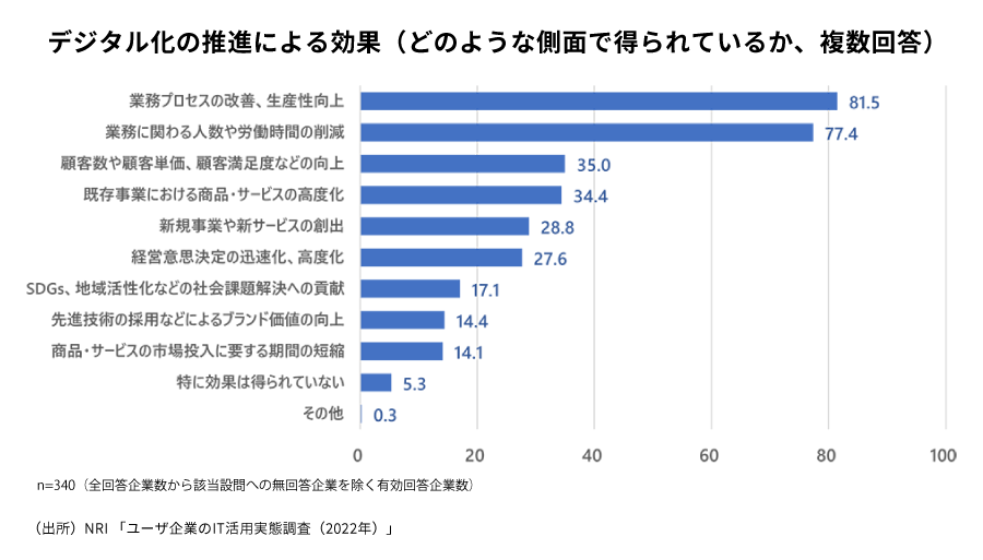 では、デジタル化の効果として「業務プロセスの改善、生産性向上」と「業務に関わる人数や労働時間の削減」を挙げる企業が多く見られました。「この2つの項目は、個人のスキルやリーダーシップがより重要なDX2.0ではなく、DX1.0の世界です。DX1.0で求められるのは、個人よりも組織単位でデジタルのケイパビリティ(組織能力)を高めることです」