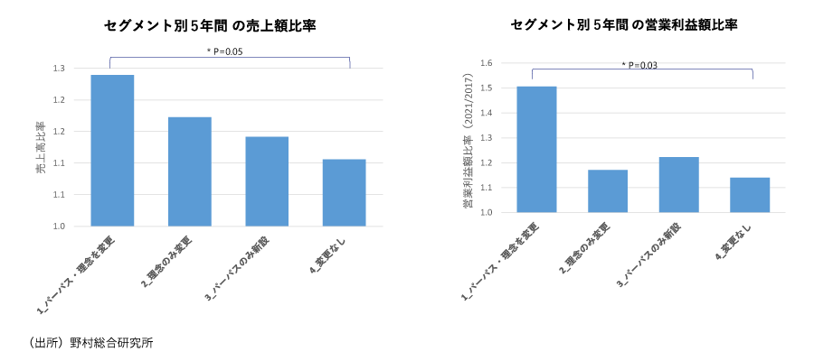 そして、パーパスや理念の改訂の効果については、予想を超えた結果が得られました。顕著なところでは、①パーパスや理念を併せて改訂した企業群は、④パーパスや理念の改訂がない企業群に比べて、5年間の売上高比率で+2割、営業利益額比率・営業利益率改善ポイントでも統計的に有意差が認められるほどの良いパフォーマンスが見られたのです。