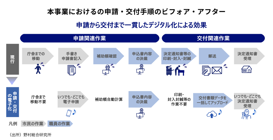 一連の作業の中で、黒田が特に注意を払ったのが、調整事項に抜け漏れがなく、業務の全体像を正しく把握することでした。そのため、「市民から申請書を受け取る」、「決裁システムに登録するボタンを押す」というように、細かい粒度で担当職員に業務手順を書き出してもらいました。その結果、ワークシートの完成によって必要な調整等の作業が明らかになると共に、それぞれの作業の状況や調整結果の証跡を残しながら、それらを1つずつ着実に解消していくことができました。現場での地道な作業に加えて、関係課との調整が滞っている箇所は、デジタル室の室長から関係部署の部長級または課長級の職員に直接働きかけるトップダウン型のアプローチで、スピードアップを図りました。