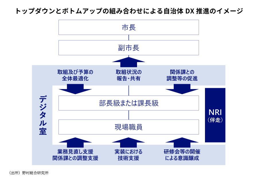 第一弾の取組を通じて黒田が実感したのは、特に自治体DXではトップダウンとボトムアップのそれぞれの型のアプローチを組み合わせることが重要だということです。トップダウン型のアプローチについては、デジタル化の推進に対する首長のリーダーシップはもちろんのこと、鶴岡市のケースでは、要所要所でのデジタル室の室長のサポートが有効に機能していました。また、市役所の中で個別最適化されている情報システムやサービスの導入に関する取組や予算について、デジタル技術利活用調査や予算要求ヒアリングなどを通じて全体最適を図るということも有効でした。
