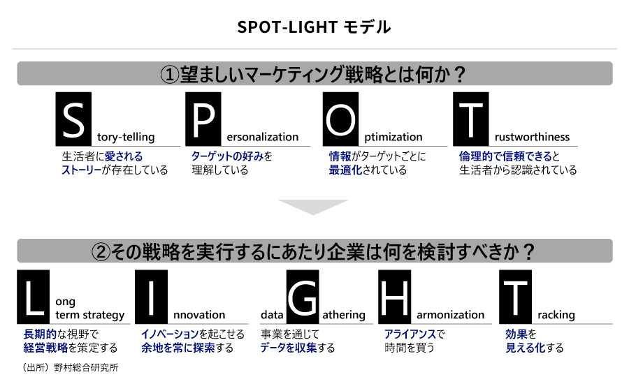 SPOT-LIGHTモデルとは、「Story-telling」「Personalization」「Optimization」「Trustworthiness」「Long term strategy」「Innovation」「data Gathering」「Harmonization」「Tracking」の9つの要素を集約した考え方で、マーケティング戦略の設計および実行の要諦となります。