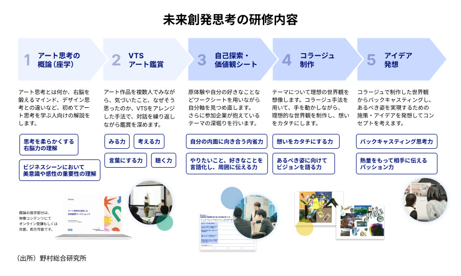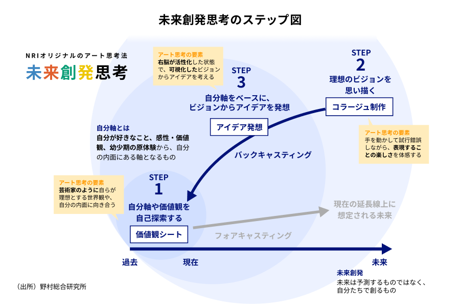 こうした問題意識からNRIが独自に開発したのが「未来創発思考」研修です。アーティストは作品を通じて自分の思い描く世界観を表現し、問いを投げかけます。それと同じように、ビジネスパーソンも「自分軸」をベースに理想のビジョンを構想し、未来創発的にアイデアを生み出し、アート思考をビジネスの中で実践するステップを体系立てて学べるようにしたいと山崎は考えました。似て非なるデザイン思考との違いは、ユーザーの課題を発見し解決へ導く「ユーザー視点型」であるのに対し、アート思考は自分自身の想いを起点とした内発的な発想の「自分起点型」です。自分の好きなこと、感性や価値観、幼少期の原体験など自分の内面自己探索から出発する点も研修の大きな特徴となっています。
