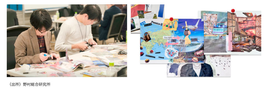 参加者は、最初にアート思考に関する座学を受けた後、ファシリテータによる問いかけにより対話をしながらアート鑑賞を深め、みる力・考える力・言葉にする力・聴く力などを養います。その後、ワークシートを用いてステップ1の原体験・価値観の「自分軸」を言語化した後、ステップ2では参加企業が抱えるテーマにおいて、社員一人ひとりが将来のありたい姿やビジョンについてコラージュ手法(紙の切り貼り)を用いて可視化します。山崎がフレームワーク化する際に意識した点は、手を動かして楽しかっただけで終わらせないことです。「バックキャスティングでアイデアを具体化し、研修後も参加企業の中で実施検討いただけるところまで研修内で行うようにしました。また、研修の事前に参加企業の担当者の方と会話を重ね、企業ごとに個別最適化したテーマ設定にアレンジしています」。