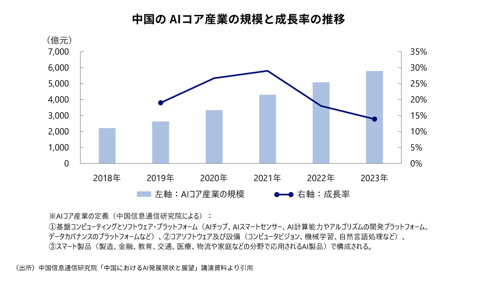 中国信息通信研究院の統計によると、中国のAIコア産業の規模は2023年末までに5,784億元に達し、約13%という高い成長率を維持しています。AI企業数でも5,734社を超え、2023年6月には世界2位につけ、世界のAI企業の約16%を占めるまでになりました。