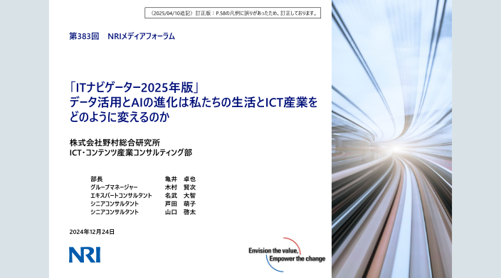 野村総合研究所(NRI)では、2000年から毎年、ICTおよびメディア・コンテンツ市場を展望し、これからの ビジネスモデルの変容の可能性を洞察する『ITナビゲーター』を出版しています。2025年版では、16分野のデータを取り上げ、8の市場を予測しました。