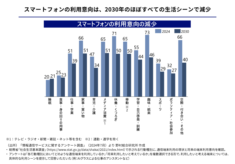 スマートフォンの補助機能として導入されはじめた生成AIですが、今後はその用途を補助するイヤホン、グラスといった端末での普及が広がると考えられます。こうしたポストスマホデバイスの浸透によって、消費者は「スマホ漬け」から開放されるとともに、AIがより身近な存在として、消費者体験において重要な役割を果たす可能性があります。