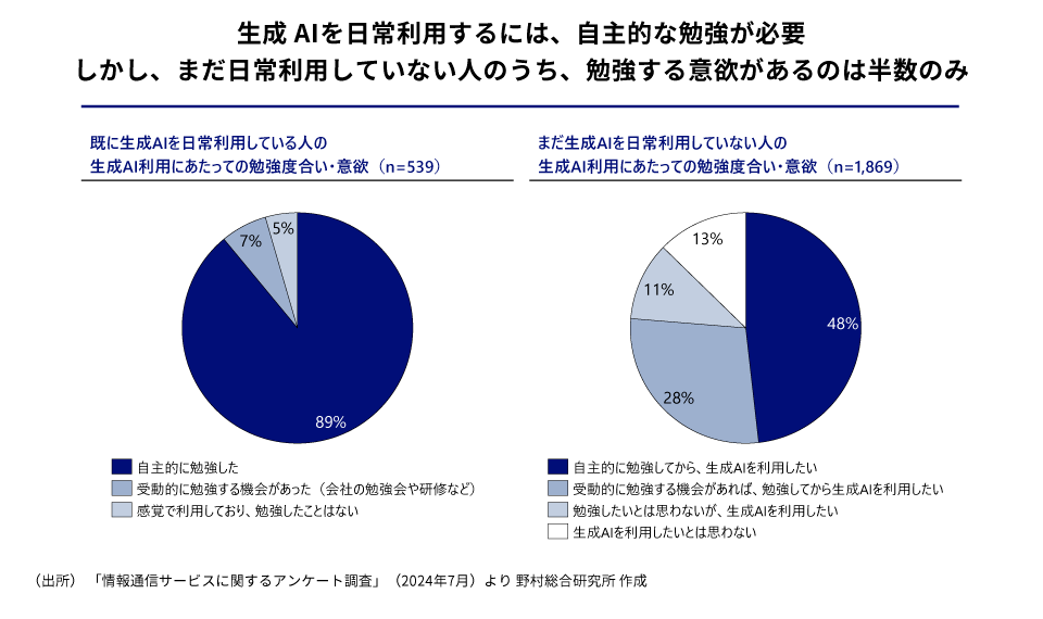 個人が生成AIを有効に活用するには、パーソナルAIだけでなく自由度の高い汎用型AIも取り入れ、積極的に学ぶことが必要です。企業では自社業務に特化したAIエージェントを開発することで、社員がAIを使いこなすことが期待されます。しかし、AIエージェントは既定されたワークフローでしか動かないため、独創的な発想は生まれません。そのため、どんな用途のAIエージェントが効果的かを考えながら、それらを取り入れていく必要があります。