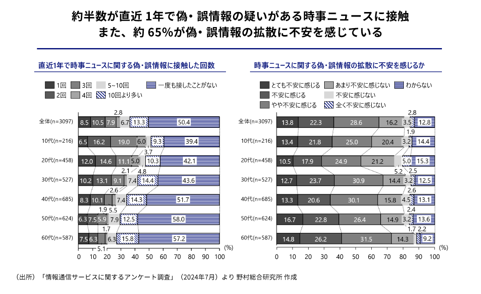 近年、偽・誤情報が国内外で拡散し、人々の生命や財産に関わる問題を起こしています。政府やプラットフォーマー各社が対策を進めていますが、さまざまな面で限界があり、今や偽・誤情報が当たり前になりつつあります。約半数の人が過去1年以内に偽・誤情報の疑いがある時事ニュースに触れており、特に若い世代ほど接触しやすい傾向にあります。インターネットメディアやソーシャルメディアが急速に普及していますが、偽・誤情報があふれる社会では「ファクトチェック」への需要が大きくなり、マスメディアに対する期待が高まっています。
