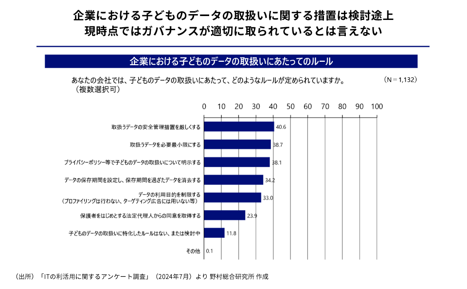子どものデータに係る規律への対応を行うにあたっては、データガバナンスの取り組みが重要です。データガバナンスとは、企業がデータ資産を素早く、効果的かつ安全にビジネス活用できる状態にする全社横断の活動を指します。データマッピング、リスク評価、通知・公表といった仕組みがデータガバナンスの基礎になり、対象とする規制が異なったとしても、この仕組みがあれば対応できます。