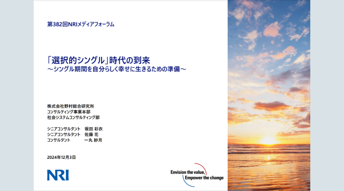 平均寿命の延伸、初婚年齢や離婚率の上昇、女性の社会進出および経済的自立、性や家族のあり方の多様化などから、「結婚は希望しておらず、選択的に未婚である状態」を指す「選択的シングル」という属性が注目されています。野村総合研究所(NRI)では、シングル・既婚者含め、現在の婚姻状態に限らず、シングルという期間をいかにウェルビーイングを保って生きる準備ができているかについて、「『選択的シングル』時代の価値観に関する調査」と題してインターネットアンケート調査を行いました。本記事は、その調査結果に加えて、「選択的シングル」を対象に行ったグループインタビューで得られた生声、シングルやシングル期間を対象とした商品・サービス、制度・政策の事例などの分析をまとめたものです。本テーマに詳しい社会システムコンサルティング部の坂田 彩衣、佐藤 花、一丸 紗月に聞きました。