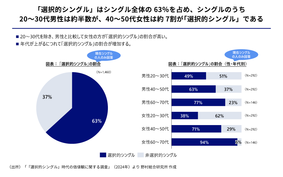 結婚は希望しておらず、選択的に未婚である状態を指す「選択的シングル」は、シングル全体の63%を占めます。20~30代を除いて男性よりも女性の方が「自身は『選択的シングル』である」と回答する割合が高くなりました。また、男女ともに年代が上がるにつれて「選択的シングル」の割合が増加するのは想定範囲内でしたが、20~30代という、いわゆる結婚適齢期とされる年代の男性のうち約半数が「選択的シングル」であることは意外な結果でした。