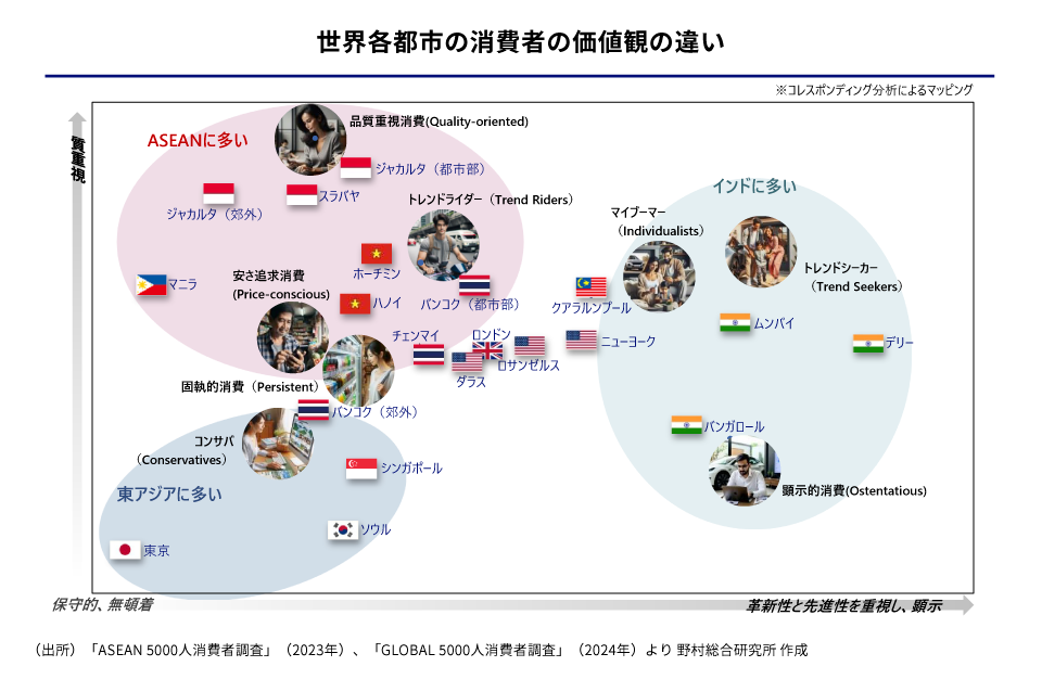野村総合研究所(NRI)は、2023年秋と2024年秋の2回に分けて世界20都市でのべ1万人の消費者に対するアンケート調査を実施し、世界各都市の消費者から見た日本のイメージを比較分析しました。加えて、ASEAN地域では、2014年から約10年間の蓄積を踏まえ、同地域の消費者から見た日本のイメージ変容についても分析しました。その結果、世界の消費者は日本とは全く異なる購買価値観を持っていることが示されました。この記事ではこれらの分析結果を報告すると共に、日系企業がどのように世界の消費者と向き合っていくべきかを提言します。本テーマに詳しい野村総合研究所タイの三宅 洋一郎、小林 俊也、マーケティング戦略コンサルティング部の松下 東子に聞きました。