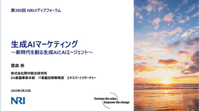 野村総合研究所(NRI)は最新のIT動向の調査結果をまとめた書籍『ITロードマップ』を2005年から毎年刊行しています。この記事では同書籍の2025年版から、生成AIの活用によって革新が進む「生成AIマーケティング」と、生成AIを支える基盤である「AI向け次世代コンピューティング」の2テーマについて、要素技術の特性や市場、主要企業の活用事例にも触れながら、今後の展望、課題などを解説します。本テーマに詳しいIT基盤技術戦略室の鷺森 崇、藤吉 栄二に聞きました。