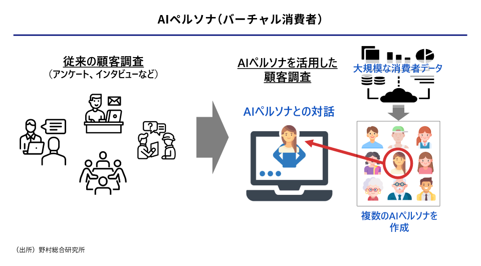 まず、マーケティング調査・分析では、企業は経済・財務データに特化した大規模言語モデル(LLM)を開発し、予測や事象の解釈に利用することで、ビジネスの意思決定が迅速化・効率化されています。また、AIペルソナ(バーチャル消費者)を生成し、消費者ニーズを分析するほか、マーケティング施策の反応について検証する取り組みが進んでいます。AIペルソナの活用領域は拡大しており、今後さらなる取り組みの進展が見込まれます。