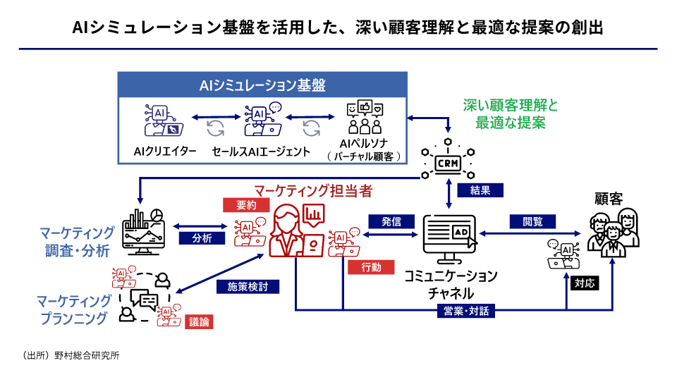 こうした課題が解消されれば、マーケティング領域での生成AI活用はより活性化していくはずです。顧客理解は一層深まり、一人ひとりのニーズに応じた提案を創出する『超個別化マーケティング』が実現するでしょう。その実現に向けて重要となるのが、AIクリエイター、セールスAIエージェント、AIペルソナなどで構成されたバーチャルなAIシミュレーション基盤です。この基盤の実現精度が、将来的には企業の競争優位性を左右する鍵になっていくと考えられます。