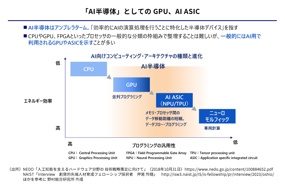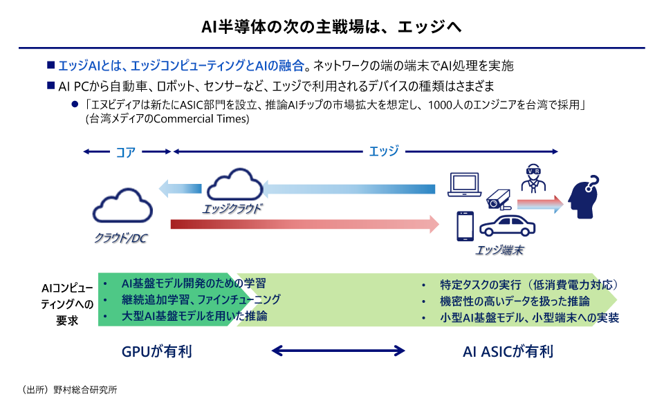こうした中、AI半導体の新たな選択肢として評価されているのがAI ASICです。もともとは画像処理用だったGPUに対して、AI ASICはAI処理専用に開発された半導体チップです。AI ASICはプログラミングの汎用性はGPUより低いものの、エネルギー効率ではGPUより優れています。「エネルギー消費が大きい」というGPUの弱点を抑えながら、AIに求められる推論の高速処理を実現できます。AI時代の本格化を見据え、既にクラウドベンダーやスタートアップがAI ASICの開発に着手しています。