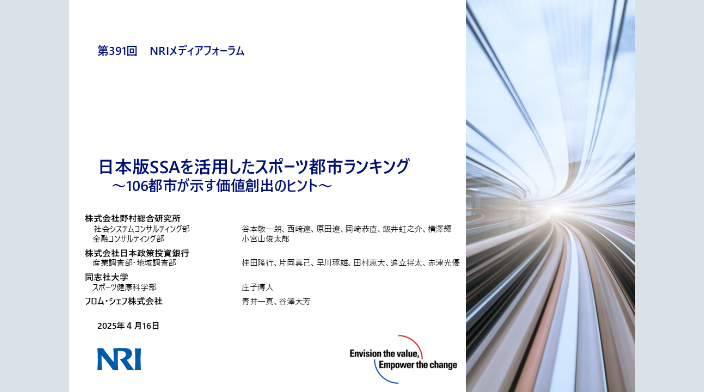 近年スポーツを活用したまちづくりに取り組む都市が増える中、効果的な政策設計のために、目指すべき方針の検討が求められています。野村総合研究所(NRI)は、株式会社日本政策投資銀行、同志社大学、フロム・シェフ株式会社と共同で、都市におけるスポーツの価値を「資産」「活動」「消費」「社会的価値」「経済的価値」の観点から分析・評価する「スポーツ都市インデックス」を作成するとともに、国内106都市を対象とした試行的評価を実施し「スポーツ都市ランキング」を作成しました。また、各指標間の相関分析を通じて、理想的なスポーツ都市の姿を明らかにしました。この記事では具体的なスポーツ都市の事例も交えながら、都市におけるスポーツを通じた価値創造のポイントを提言します。本テーマに詳しい社会システムコンサルティング部の谷本 敬一朗、西崎 遼、原田 遼、飯井 虹之介、横澤 輝、金融コンサルティング部の小宮山 俊太郎、コンサルティング人材開発室の岡崎 恭直に聞きました。