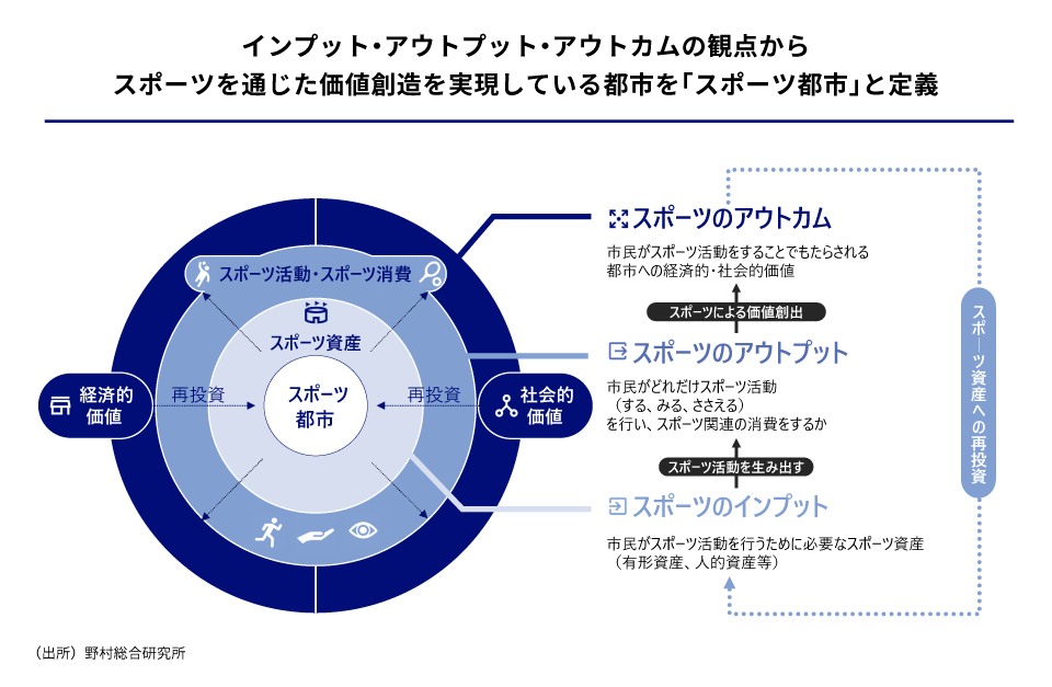 スポーツ都市インデックスは、スポーツ活動に必要な施設や環境などのスポーツ資産からなる「インプット」、インプットを基盤として行われる市民のスポーツ活動とスポーツ消費からなる「アウトプット」、アウトプットから創出される経済的価値と社会的価値からなる「アウトカム」から構成されます。NRIは、この3つの観点からスポーツを通じた価値創造を実現している都市を「スポーツ都市」と定義しました。スポーツ都市においては、スポーツ資産によって生み出される価値がさらなる再投資と価値創造を生み出す「成長サイクル」が駆動している状態が理想です。