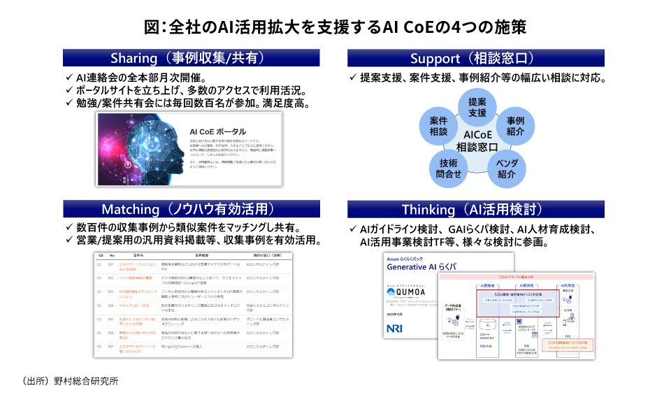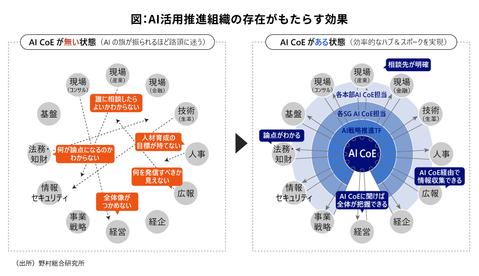 現場レベルで個別にAI活用を模索していてはディスラプションを乗り越えることができないと考えたNRI経営陣は、クイックに全社横断CoEを組成しました。一般的に、CoEは有識者やリソースを1カ所に集めて部門横断で連携する組織です。しかし、NRIでは個々の現場が強く、カバーする専門領域も幅広いため、要員や役割を厳密に定めた組織は馴染みません。技術進化の速さも勘案し、人材や知見を柔軟に結びつけるハブ機能を備えた、自由度の高いバーチャル組織として、部門横断で数十名の精鋭を集結。メンバーは各自のミッションに応じて重点的に関わったり、一部業務で集中的に参画したりする形で、AI関連の取り組みを進めていきました。
