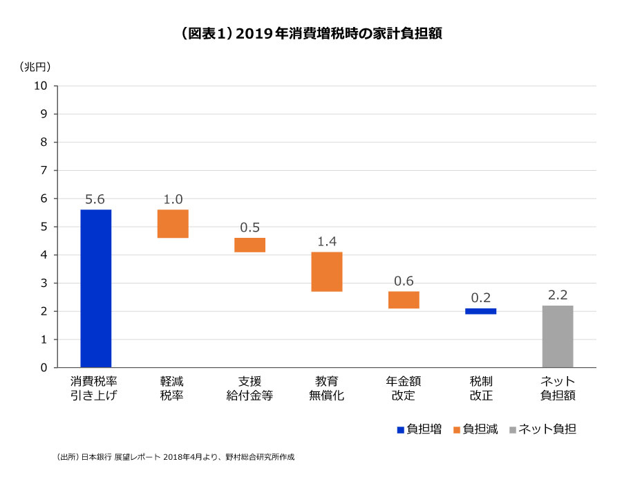 日本銀行は、2019年の消費増税時の家計負担額を2.2兆円と試算しています(図表)。これは1997年の消費増税時の8.5兆円、2014年の8.0兆円と比較して格段に小さいものです。それは、①税率の引き上げ幅が2%(8%から10%)と前回の3%よりも小さいこと、②軽減税率導入など恒久的な措置が家計の所得負担減に寄与すること、によるものです。さらに、2014年に消費増税が実施された時点では、翌年にも追加の増税が予定されていたことから、それも踏まえて住宅、耐久財の駆け込み購入が多く発生しました。その時点でかなり先の将来まで視野に入れた駆け込み購入が既に出てしまったとも考えられます。こうした点と税率の引き上げ幅が小さいことを考え合わせれば、2019年の消費増税の際に発生する駆け込み購入の程度はより小さく、その結果、反動減も小さくなる可能性が高いでしょう。
