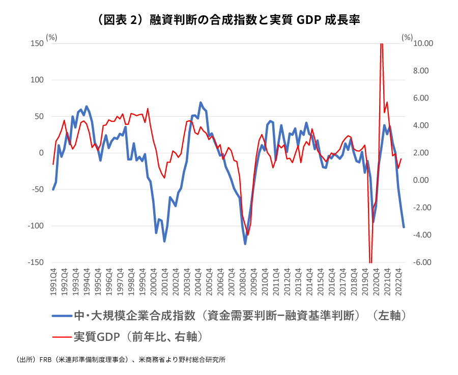 5月に発表されたFRB(米連邦準備制度理事会)の銀行融資調査では、銀行の融資基準の厳格化が進むとともに、企業の資金需要が悪化していることが確認されました。この融資の供給面と需要面の双方の影響を反映する複合指数を作成すると、企業向け融資の環境が、2000年のドットコムバブル崩壊時、2008年のリーマン・ショック時、2020年のコロナショック時と並ぶ水準まで悪化しており、この先、米国経済が本格的な景気後退に陥るリスクが相応にあることが示唆されます(図表2)。