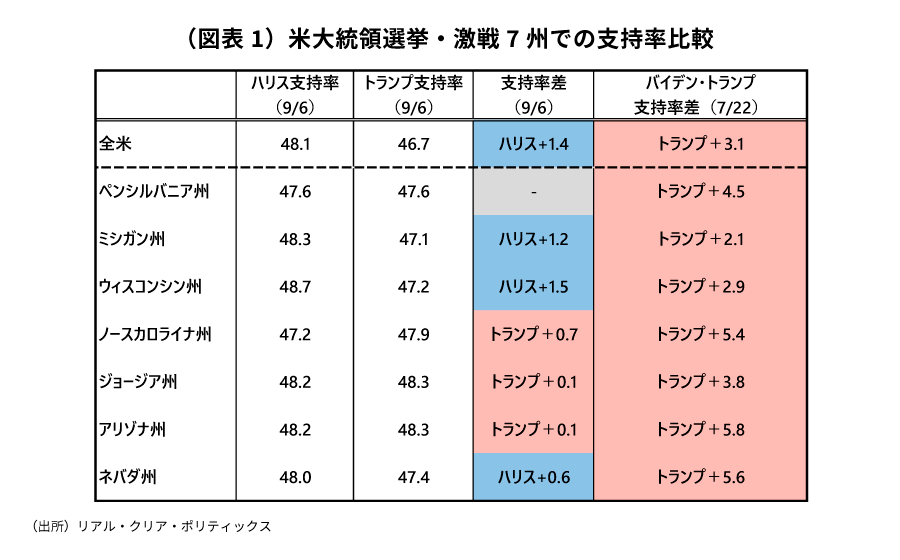 2024年7月に民主党のバイデン大統領が選挙戦からの離脱を決めたことで、共和党の大統領候補であるトランプ氏が有利とされていた米国大統領選挙は、仕切り直しとなりました。バイデン大統領から後継指名を受けた後任のハリス副大統領は予想外に支持を集め、全米支持率ではトランプ氏を上回っています。しかし選挙の勝敗を決めるとされる激戦7州では両者は拮抗しており、勝敗の行方はまだ五分五分の状況です(図表1)。7月の襲撃事件直後にトランプ氏勝利との見方が強まった時点でも、またその後にハリス氏が躍進してからも、金融市場はあまり反応を示していません。金融市場は、大統領選挙の結果が経済に与える影響を測りかねています。