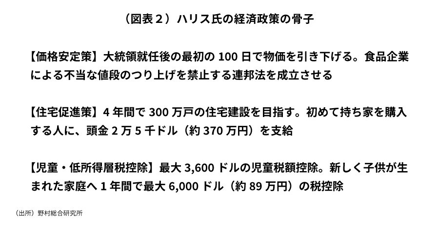 またハリス氏は、8月16日に独自の経済政策案を打ち出しました(図表2)。これは、中間層支援と物価高対策を2本柱としています。他方で、エネルギー政策、税制、貿易政策などは含まれず、経済政策分野のごく一部に絞ったものでした。
