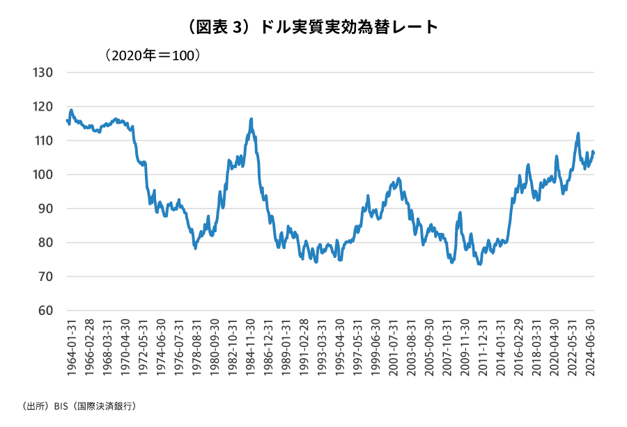 また、世界経済や金融市場の環境についても、トランプ政権が発足した8年前とは、大きく異なることを忘れてはならないでしょう。中国経済は現在失速状態にあり、世界経済はより脆弱です。また、FRB(米連邦準備制度理事会)の大幅利上げの影響で、ドルの水準はかなり切り上がった結果、ドルが大きく下がるリスクがこの4年間で一段と高まっていると考えられます(図表3)。