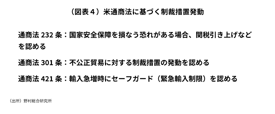 さらに重要なのは、追加関税の導入は、米国通商法に基づいて、大統領の権限で実施できてしまうことです(図表4)。強大な大統領権限を再び獲得したトランプ氏が実施する追加関税は、世界経済にとって計り知れないほどの大きなリスクでしょう。