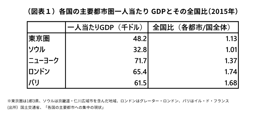 東京への過度な人口集中は、日本経済全体の効率を押し下げているのではないかと思われます。各国首都の人口当たりGDP、つまり生産性が、国全体の平均と比べてどの程度の水準になるかを計算すると、2015年時点で東京都の人口当たりGDPは全国平均の1.13倍と、ニューヨークの1.37倍、ロンドンの1.74倍、パリの1.68倍などと比べてかなり低い水準にとどまっています(図表1)。
