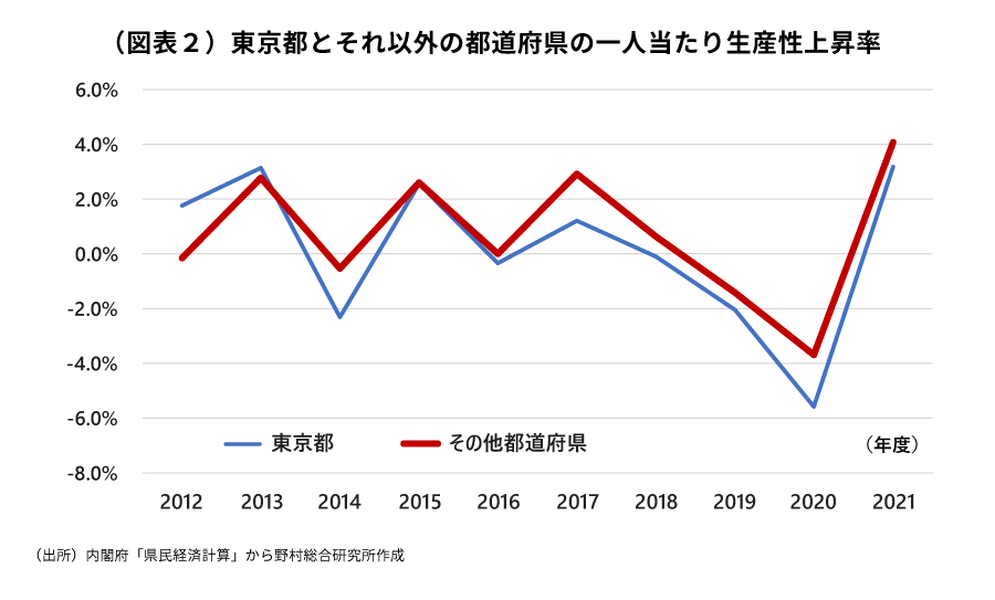 2021年までの5年間の年平均値で見ると、他の都道府県の生産性上昇率は+0.5%であったのに対して、東京都は-0.7%とマイナスに沈みました。