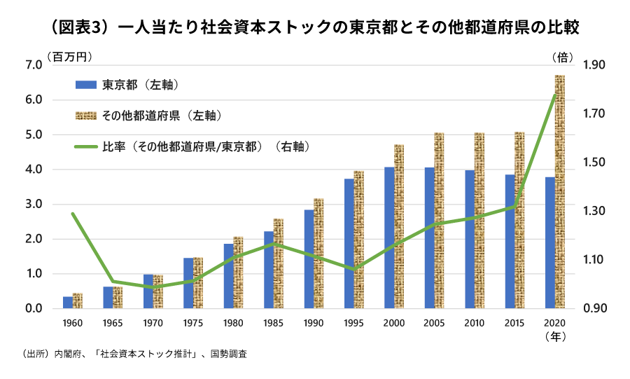 さらに、2015年から2020年の5年の間に、両地域間の格差は急拡大し、2020年時点で、東京都以外の都道府県の人口当たり社会資本ストック金額は、東京都の1.78倍にまで達しているのです(図表3)。